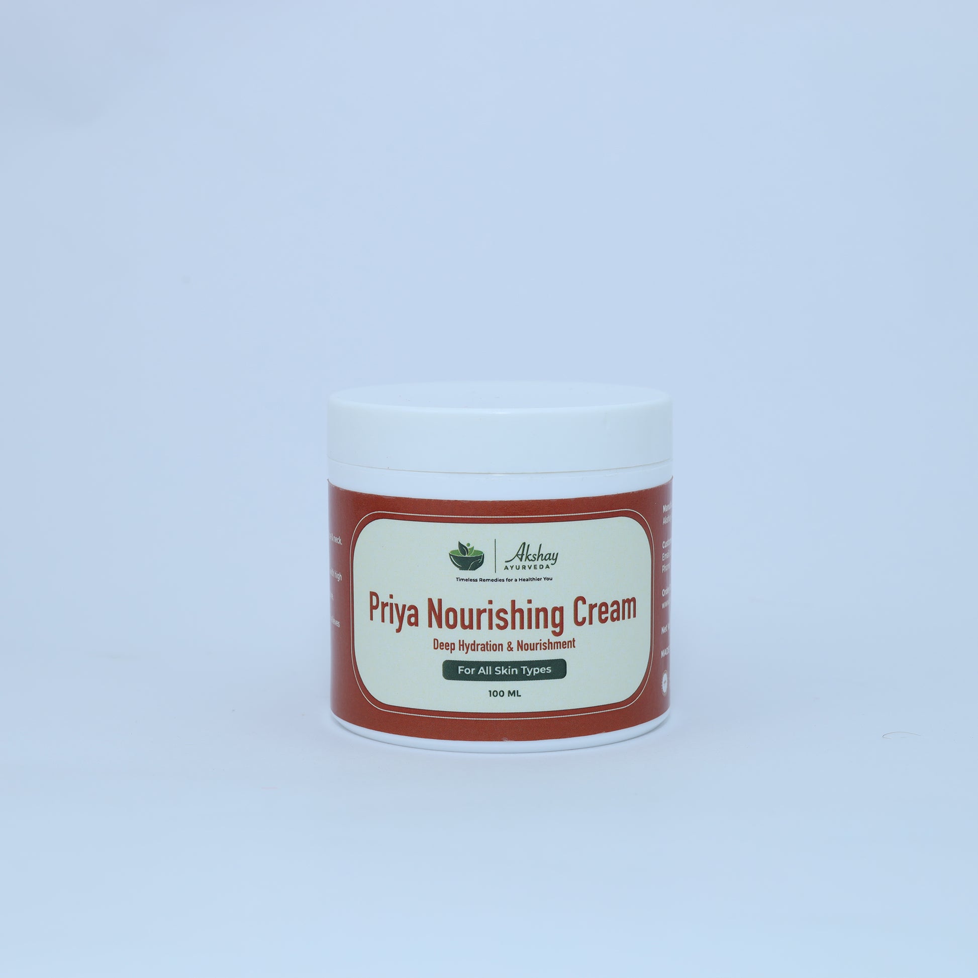 Priya Nourishing Cream blends aloe vera, shea butter, and rose oil to provide deep hydration, smoothness, and a radiant glow. It helps heal dry skin, improves elasticity, and keeps your skin soft and supple throughout the day.